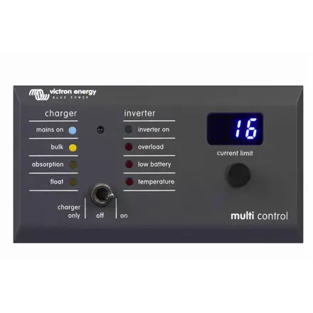 Panel pre vzdialené ovládanie a sledovanie meničov/nabíjačiek radu MultiPlus a Quattro a to v samostatnom, paralelnom aj trojfázovom povoze. Umožňuje páčkovým spínačom vzdialene zapínať a vypínať pripojené zariadenie, prípadne voliť režim „iba nabíjačka". Ďalej umožňuje meniť hodnotu maximálneho vstupného prúdu zo siete alebo iného zdroja striedavého prúdu. Nastavená hodnota sa trvalo zobrazuje na digitálnom displeji. Panel zobrazuje pomocou LED diód prevádzkový stav. Naľavo sa zobrazuje zapnutie/vypnutie meniča, preťaženie spotrebičmi, nízky stav nabitia akumulátorov a vysoké teploty zariadenia. Napravo sa zobrazuje napojenie na sieť (generátor) a fáza nabíjania akumulátorov. Prepojenie s ovládaným zariadením je pomocou UTP kábla s koncovkami RJ45 (nie je súčasťou dodávky). Panel je určený na vsadenie do steny, elektrokrabice a podobne. Panel má tlačidlo konfigurácie pre individuálne nastavenie. Ďalšie informácie v návode nižšie.